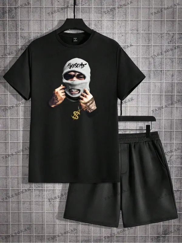 EMRG Siyah Örgü Erkek Karakter Baskılı Kısa Kollu Grafik Erkek T Gömlek Ve Şort Tak
