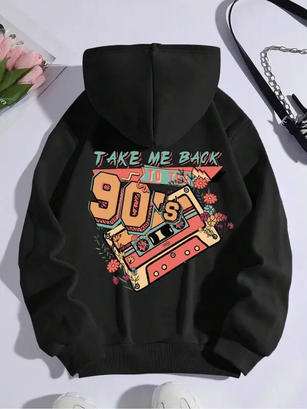 Cartoon And Korean Letter Graphic Drawstring Lined Hoodie Siyah