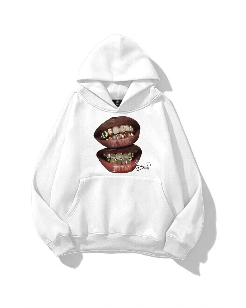 YQYQ----Oversize Mor Saçlı Lila Genç Kız Tasarım Baskılı Unisex Kapüşonlu Sweatshirt Hoodie Beyaz