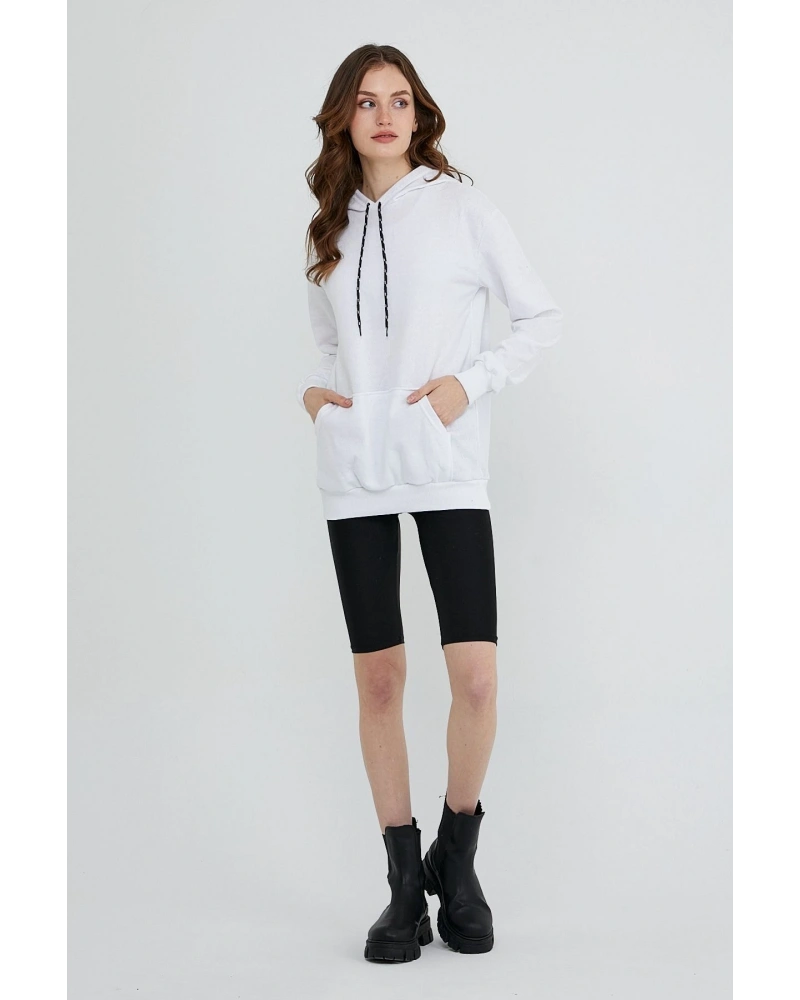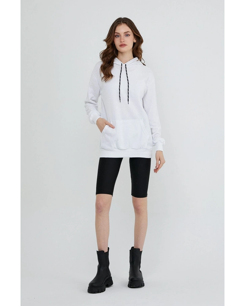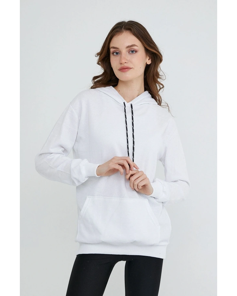 Kadın Beyaz Kapüşonlu Kanguru Cep Sweatshirt