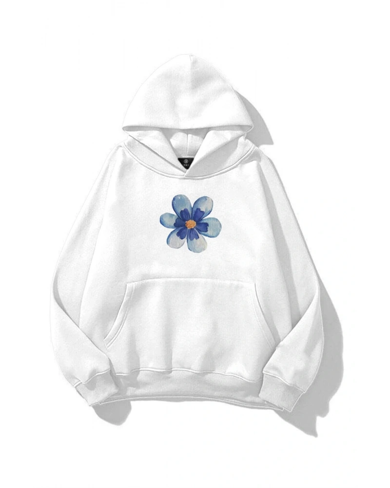 YQYQ----Oversize Mavi Boya Kelebek Temalı Tasarım Baskılı Unisex Kapüşonlu Sweatshirt Hoodie Beyaz