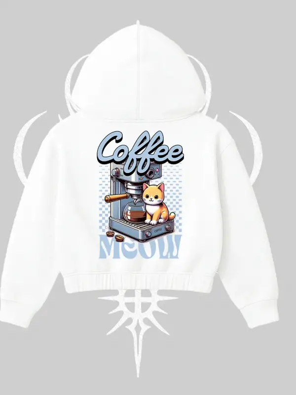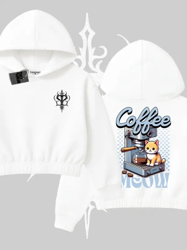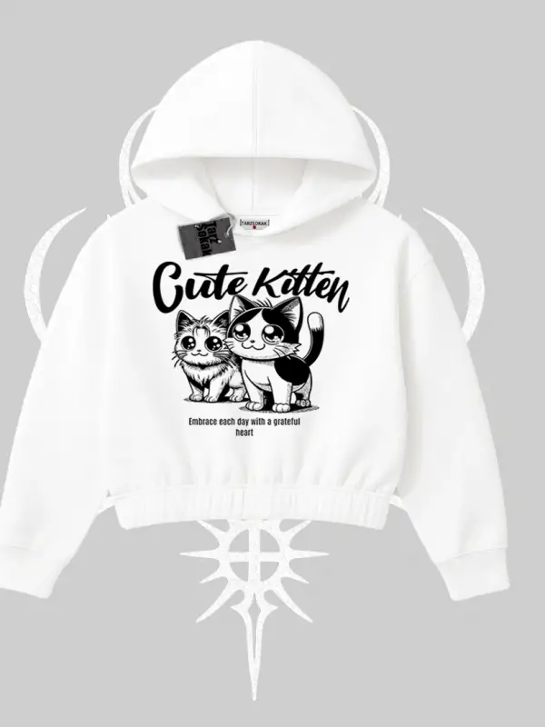 Sevimli Kedi Çizimli Arka Baskılı Kapşonlu Crop Sweatshirt
