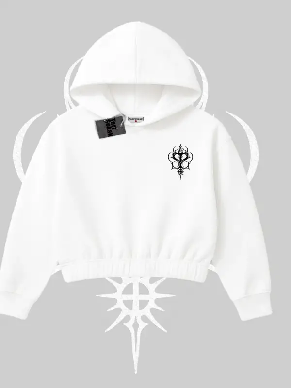 Beyaz Crop Kapşonlu Sweatshirt Vampir Dış