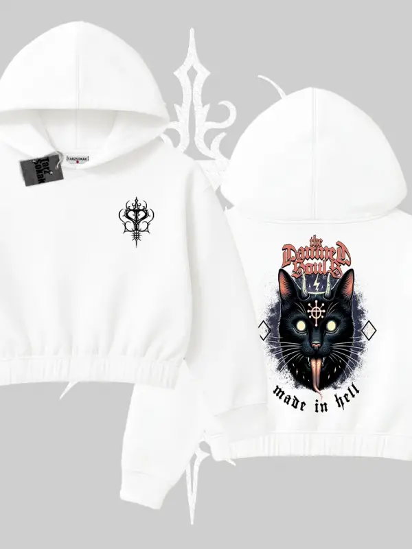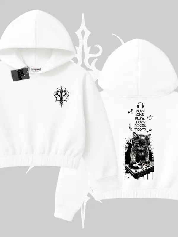 Cute Princess Kedi Tasarımlı Arka Baskılı Kapşonlu Crop Sweatshirt