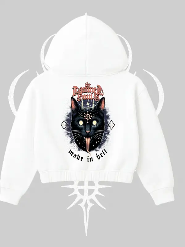 Lucky Cat Japon Tarzı Kedi Baskılı Kapşonlu Crop Sweatshirt