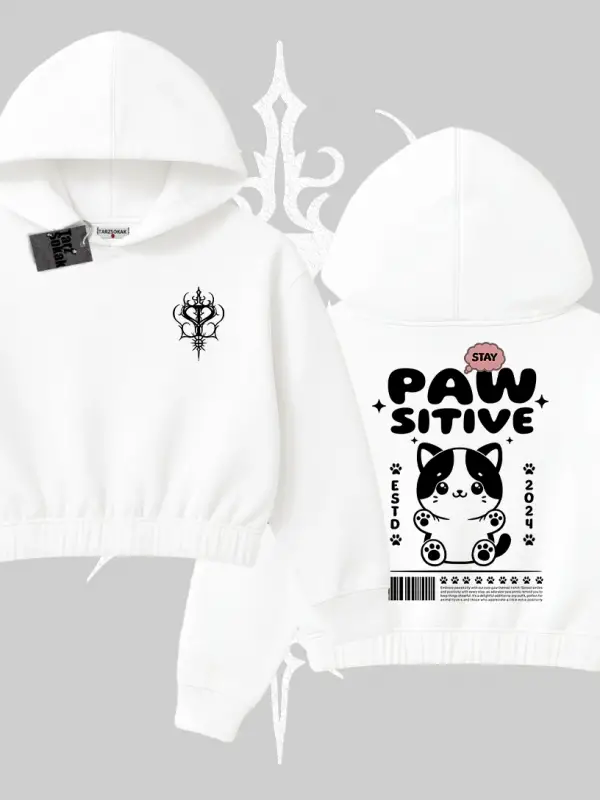 Paw Sitive Kedi Arka Baskılı Kapşonlu Crop Sweatshirt