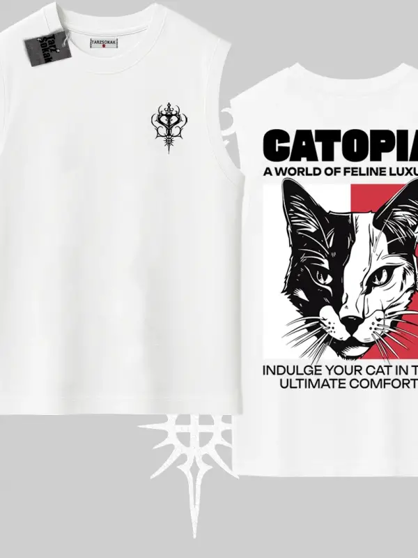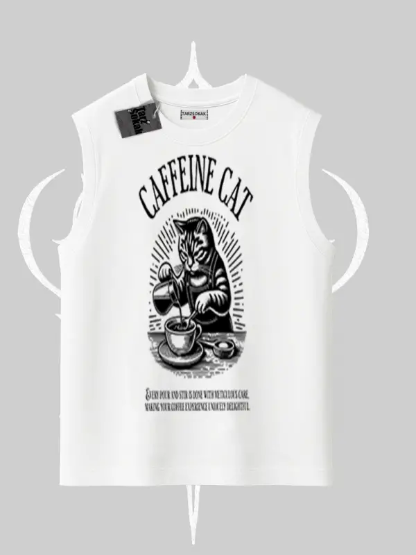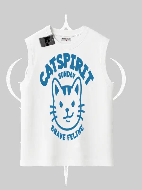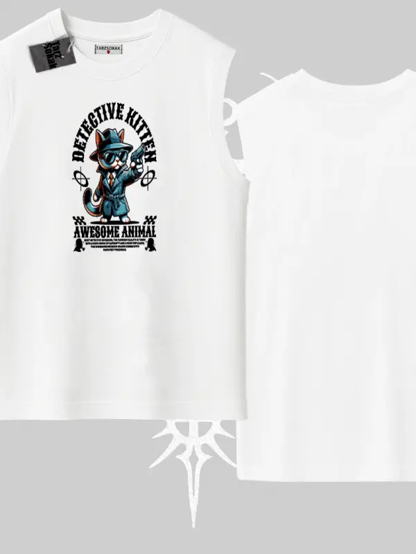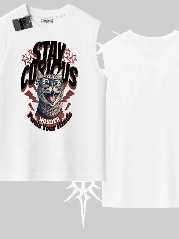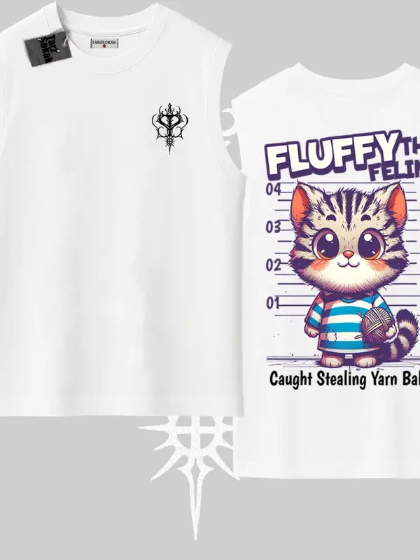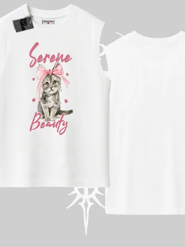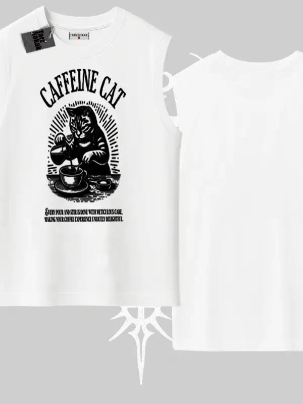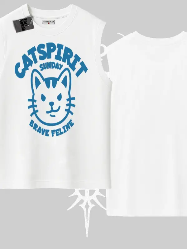 Sevimli Kedi Çizimli Arka Baskılı Kolsuz Tshirt