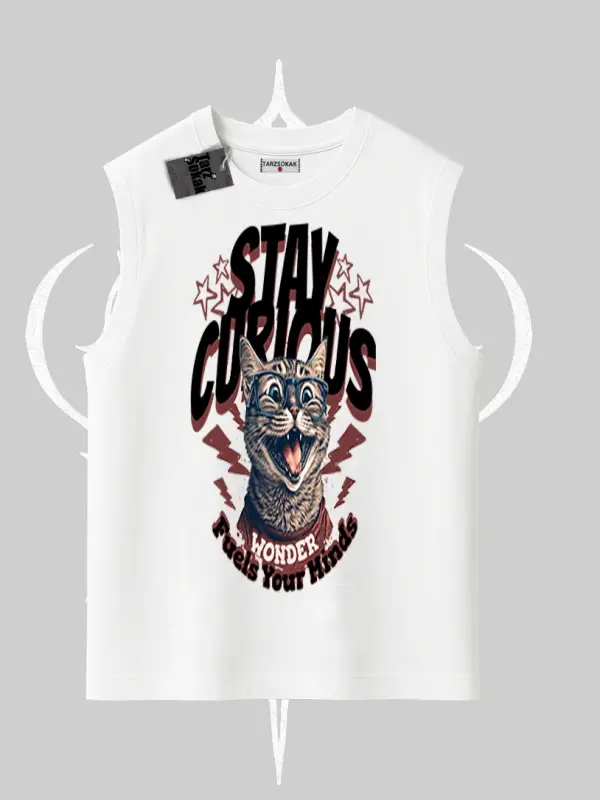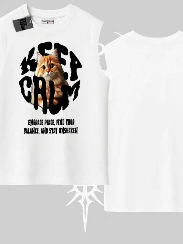 Keep Calm Yazılı Kedi Baskılı Streetwear Kolsuz Tshirt