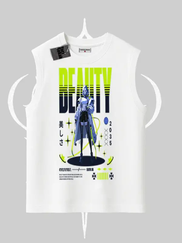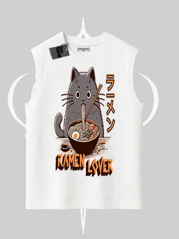 Lucky Cat Japon Tarzı Kedi Baskılı Kolsuz Tshirt