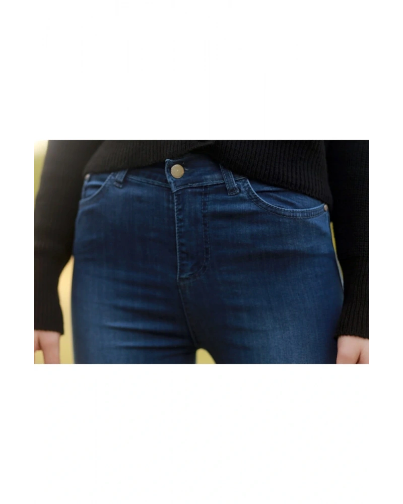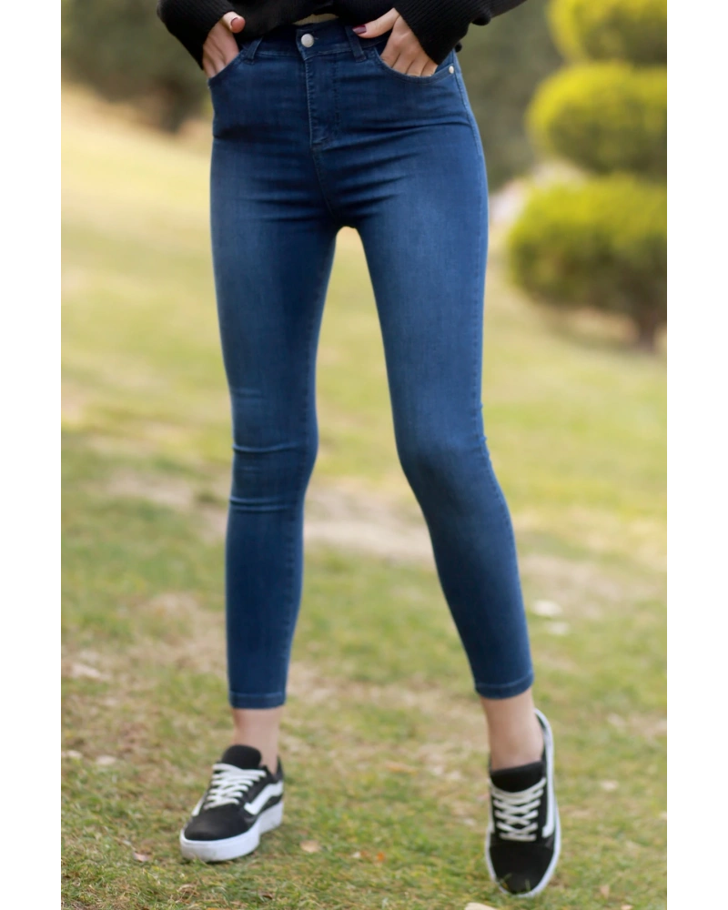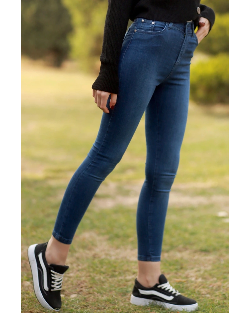 Kadın Lacivert Denim Düğmeli Mavi Yüksek Bel Jeans