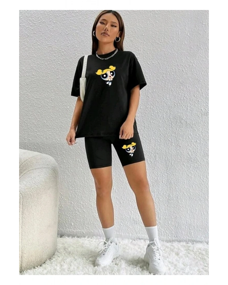 Kadın Siyah 'Göğüs Yıldız Baskılı''Oversize Şort- T-Shirt Takım strup0000000000050