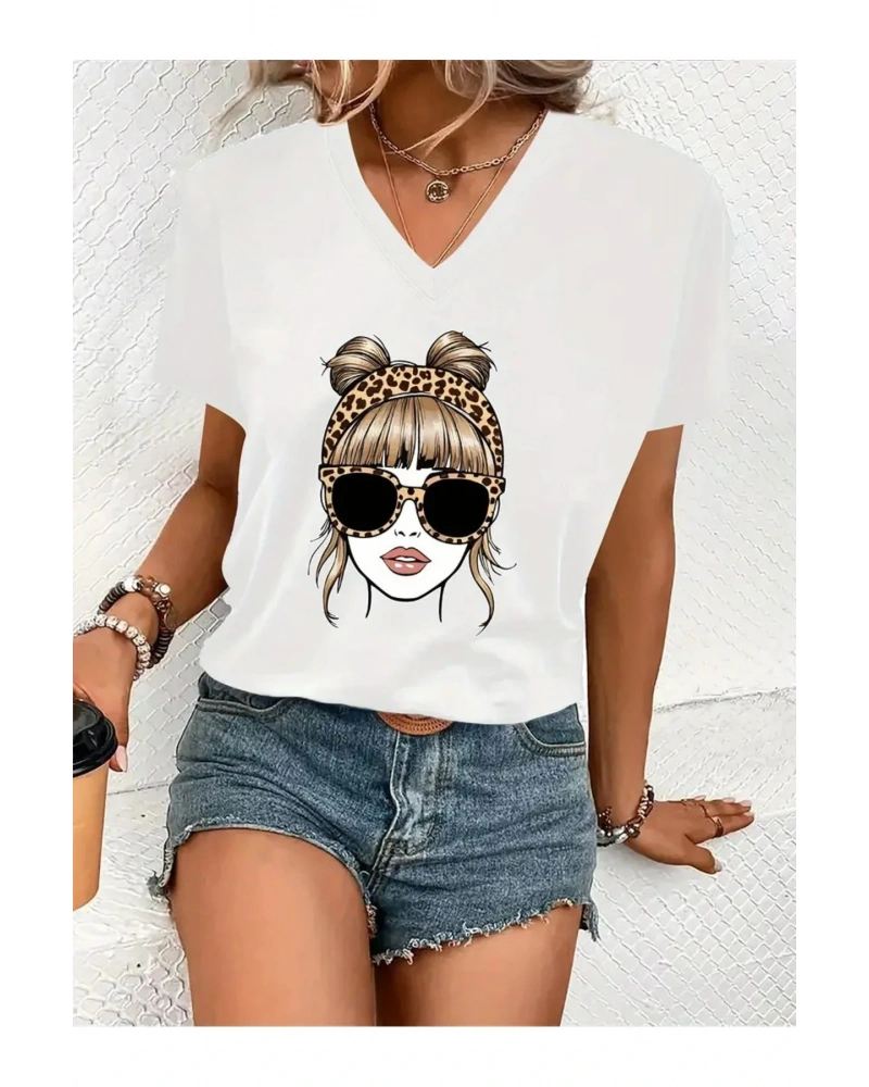 Kadın V yaka Beyaz Siyah T-Shirt Baskılı Oversize