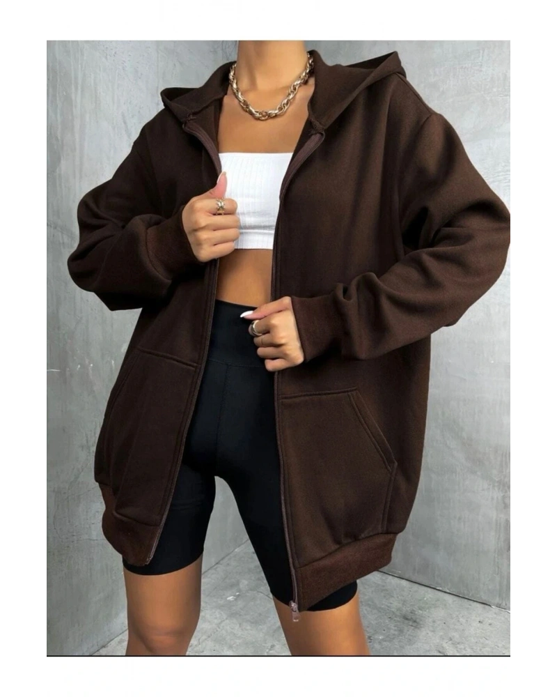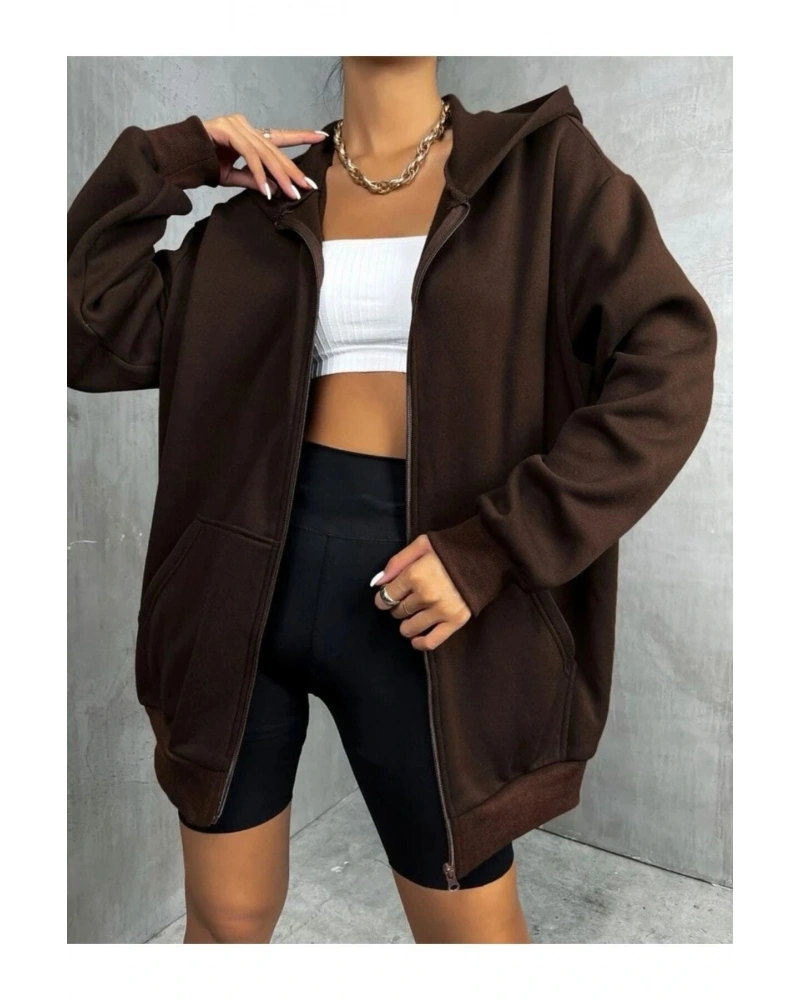Kadın Kahverengi Düz Fermuarlı Kapüşonlu Ceket benisengiydirdüzceket Kahverengi