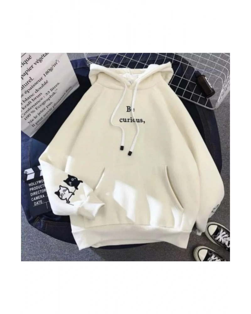 Kapüşonlu Be Curıous Kedicik Kol Baskılı 3 Iplik Tam Kışlık Oversize Kadın Sweatshı Beyaz
