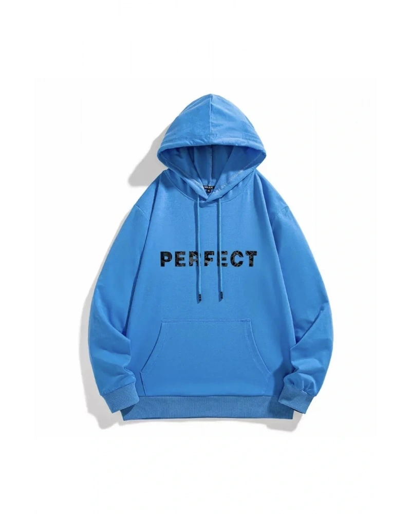 Kapüşonlu Perfect Baskılı %100 Pamuk Süper Oversize Tam Kışlık Kadın Sweatshırt LDY MAVİRENK