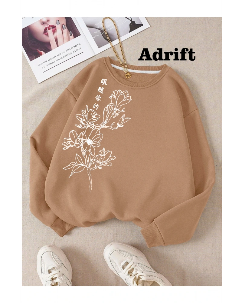 Sloganlı ve Yıldız Desenli Düşük Omuzlu Oversize Sweat Bej