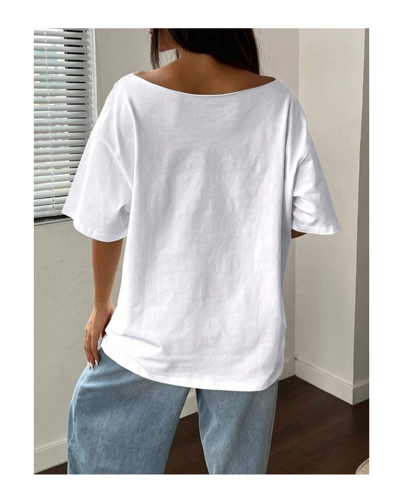 Beyaz Kadın Düşük Omuz Kayık Yaka Shy You Baskılı