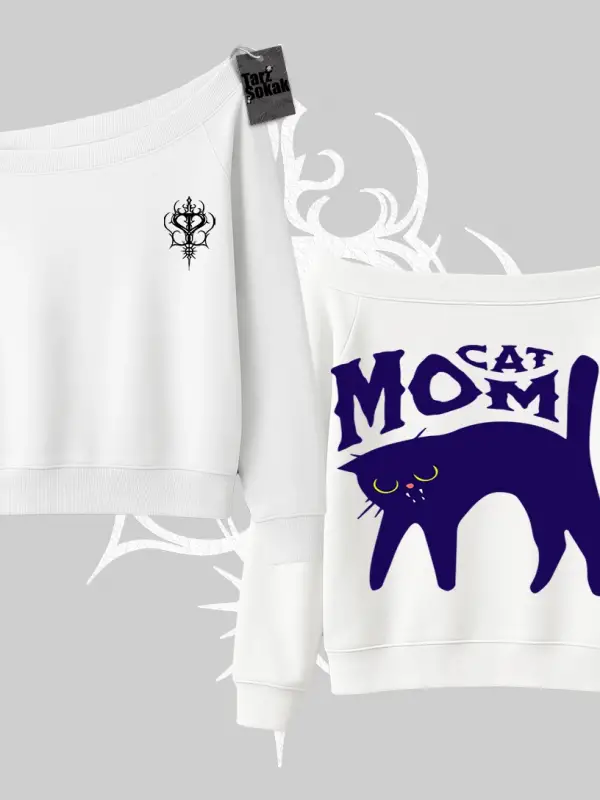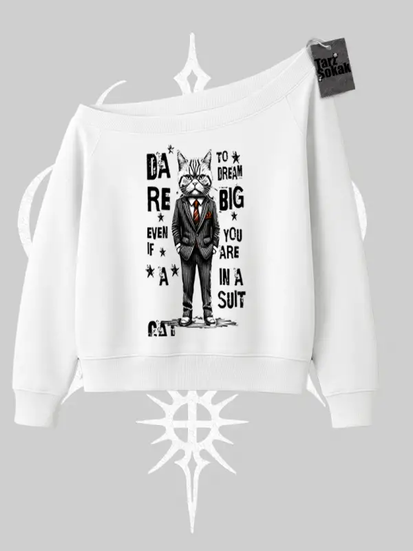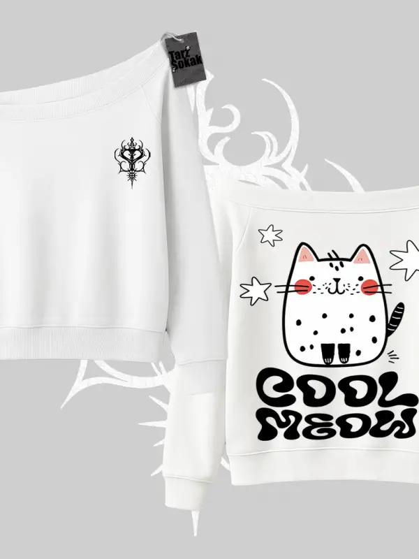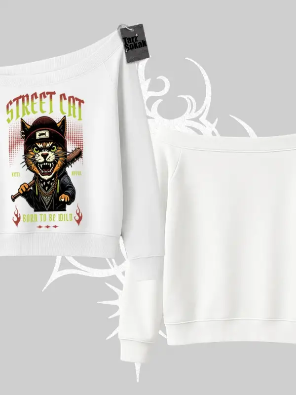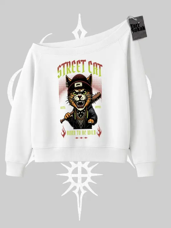 Street Cat Kedi Baskılı Kayık Yaka Sweatshirt