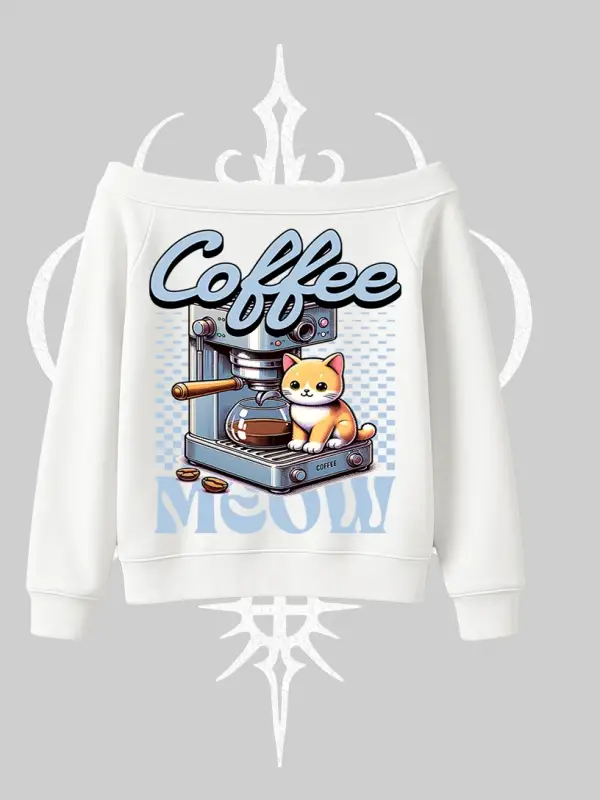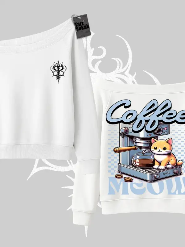 Coffee Meow Kahve Temalı Kedi Arka Baskılı Kayık Yaka Sweatshirt