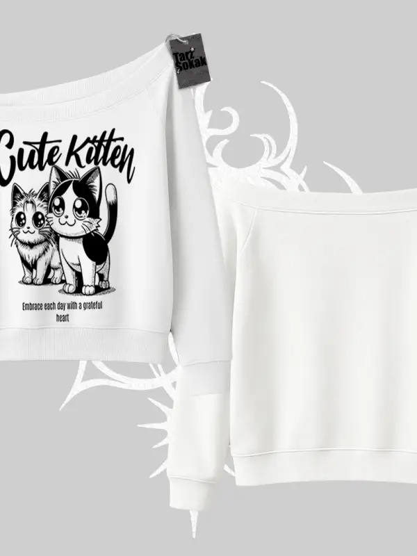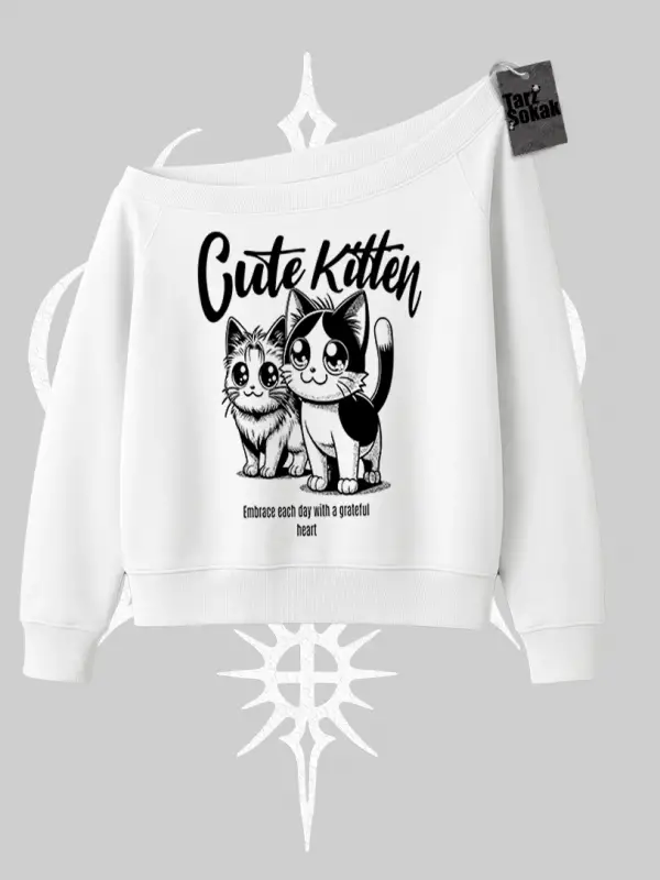 Cute Kitten Yazılı Sevimli Kedi Baskılı Kayık Yaka Sweatshirt