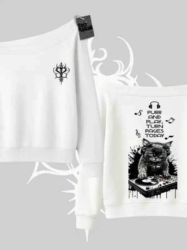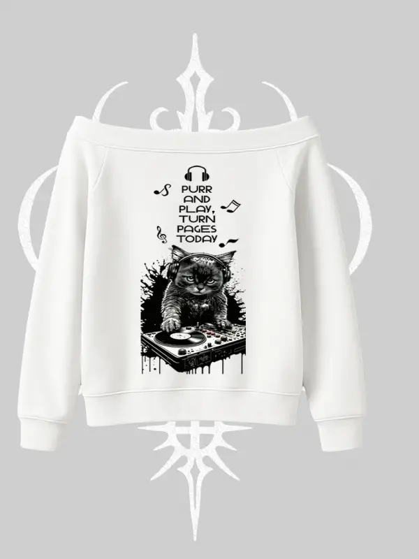 DJ Kedi Baskılı Müzik Temalı Kayık Yaka Sweatshirt