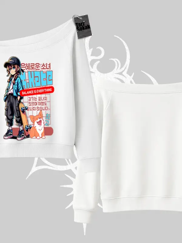 Kayık Yaka Sweatshirt Anime Hiker Girl Balance Is Everything Baskılı