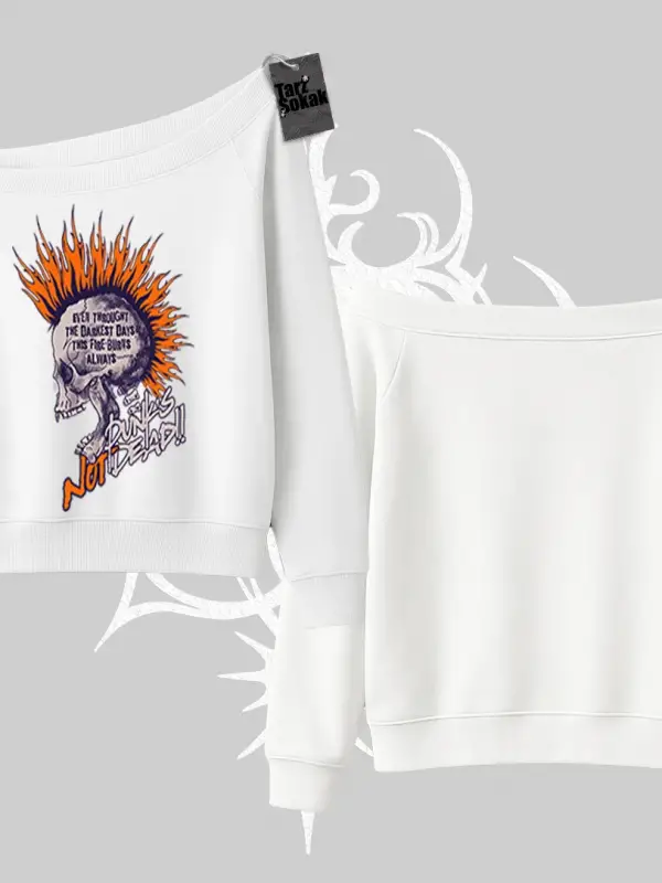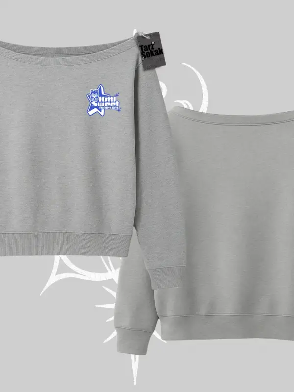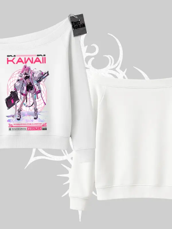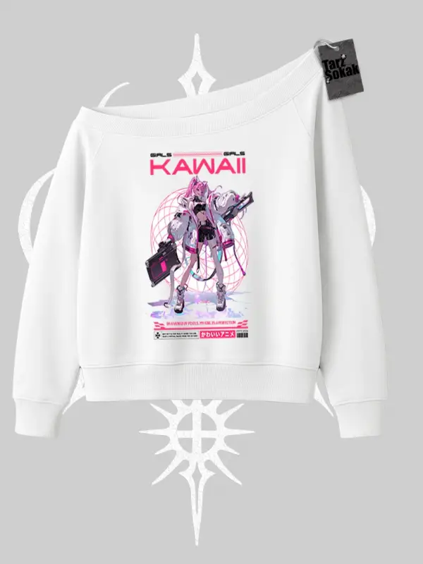 Kayık Yaka Sweatshirt Kawaii Cyberpunk Kız Japon Stil Baskı