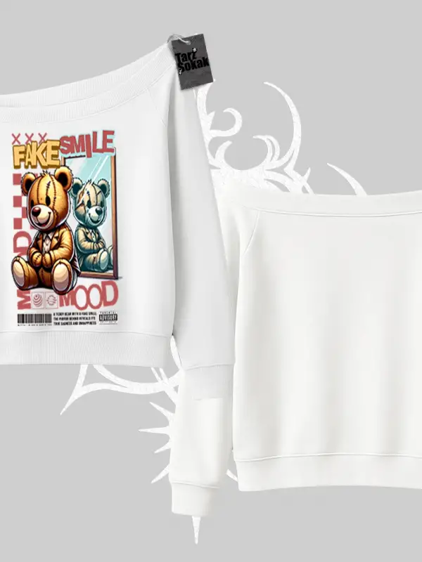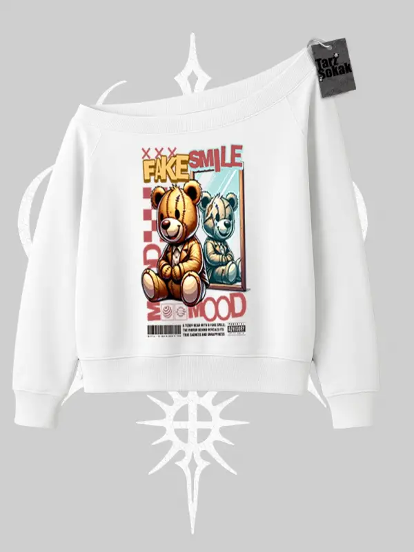 Kayık Yaka Sweatshirt Fake Smile Mood Ayıcık Grafik Baskılı