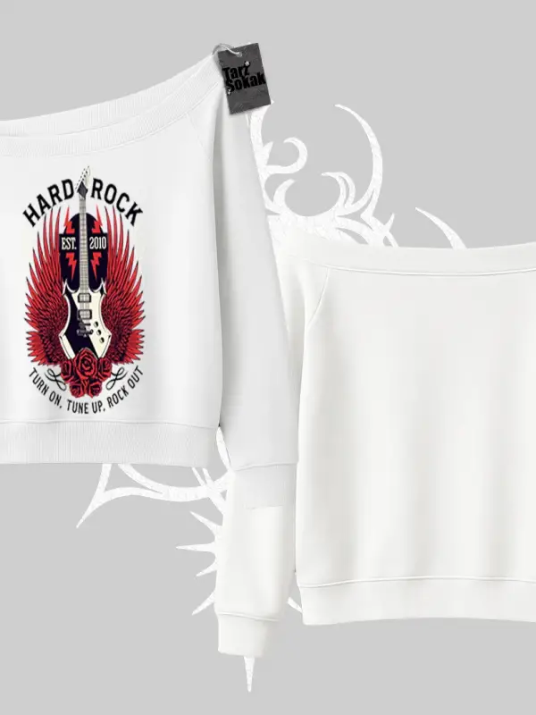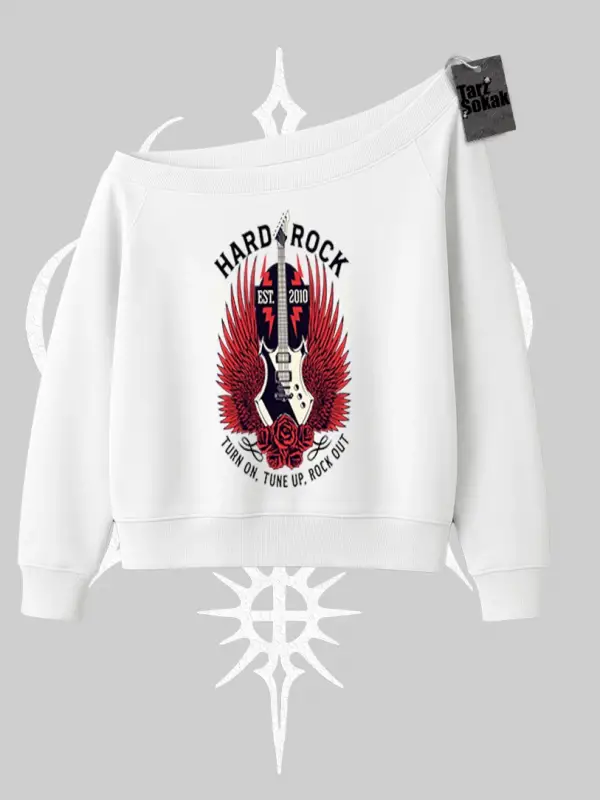 Kayık Yaka Sweatshirt Hard Rock Winged Guitar Rebellion