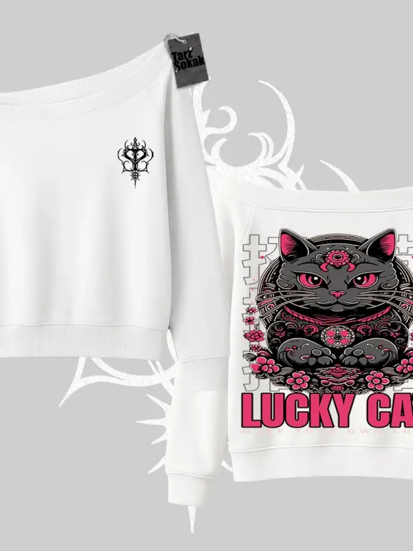Lucky Cat Japon Tarzı Kedi Baskılı Kayık Yaka Sweatshirt