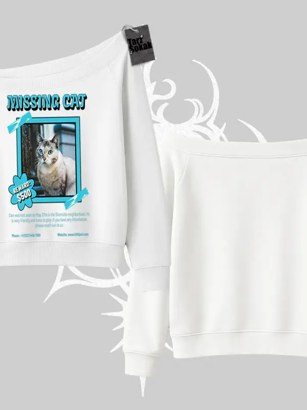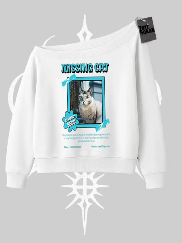 Wanted Temalı Kedi Baskılı Kayık Yaka Sweatshirt