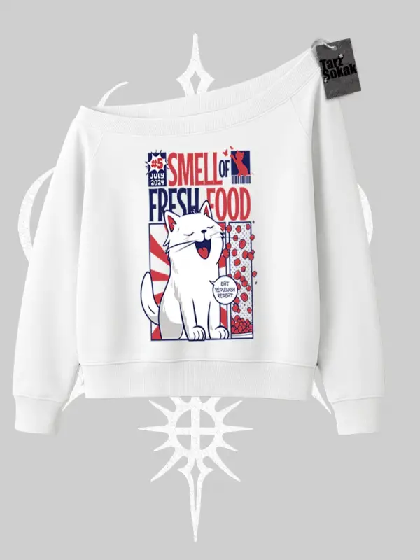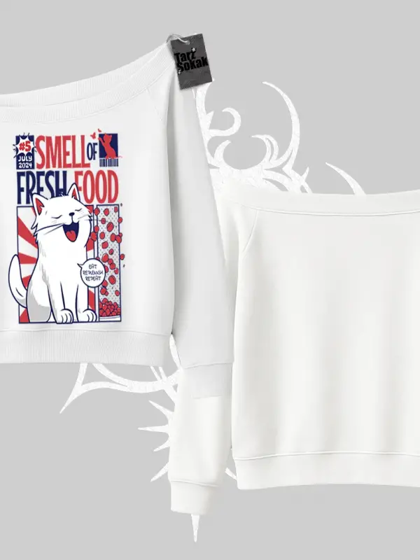 Smell of Fresh Food Kedi Baskılı Kayık Yaka Sweatshirt