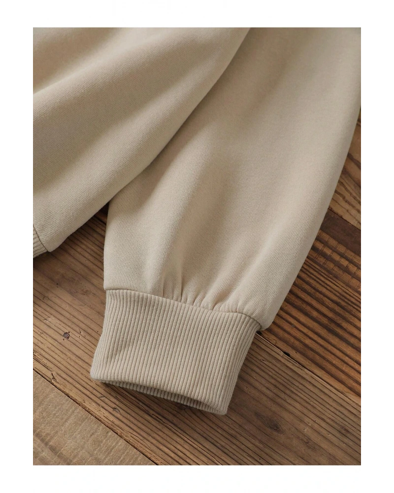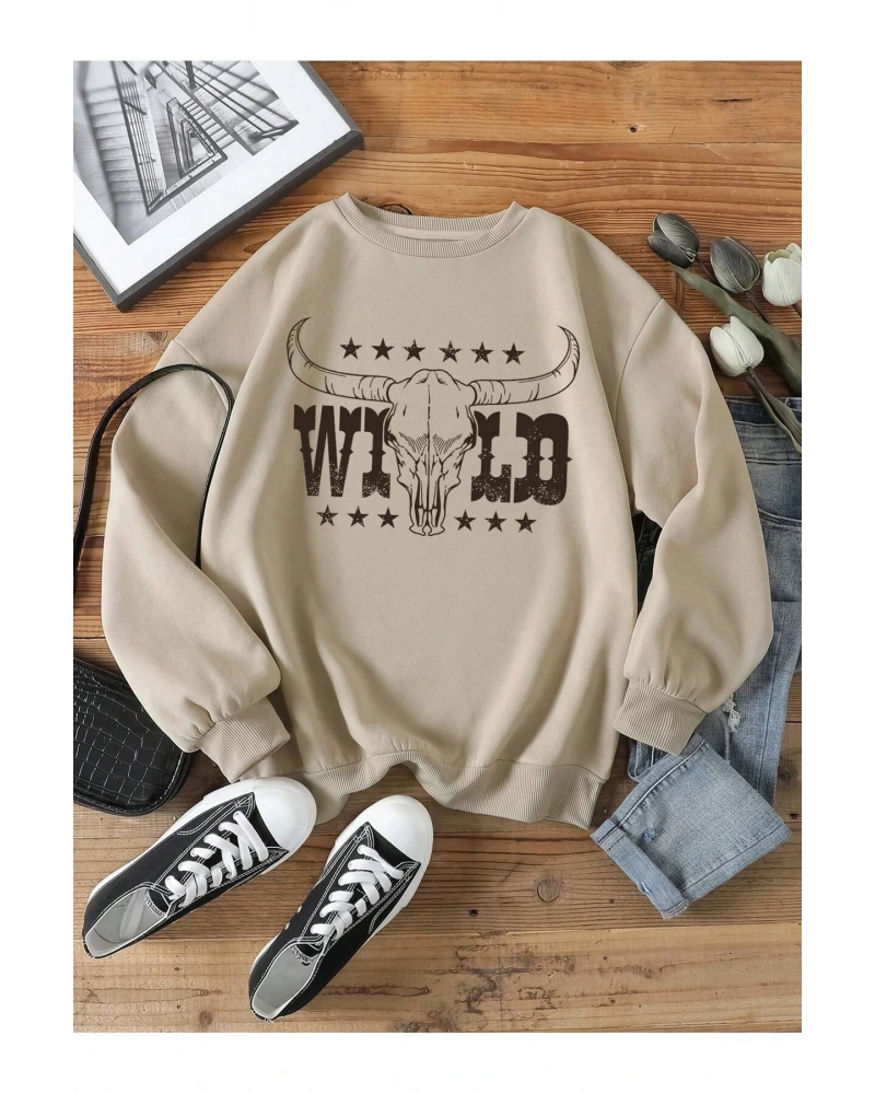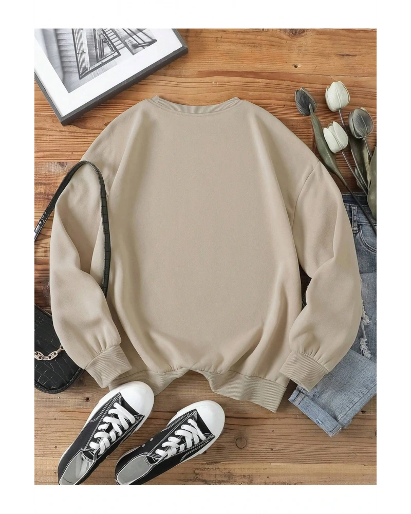 Sloganlı ve Yıldız Desenli Düşük Omuzlu Oversize Sweat Bej