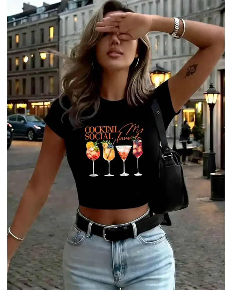 Kokteyl Sosyal Favori Baskı Kadın Kırpma Üstleri Yaz Yumuşak Yüksek Elastik Tişörtler Seksi İ kaliteli malzeme ve konforlu kullanım sunan bir üründür. Günlük kullanım için ideal olup uygun fiyat ve hızlı kargo avantajıyla sunulmaktadır.