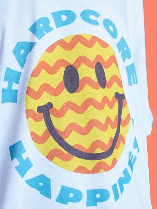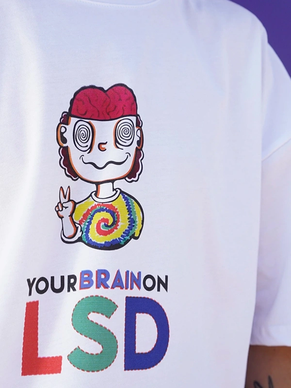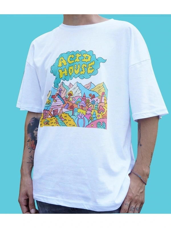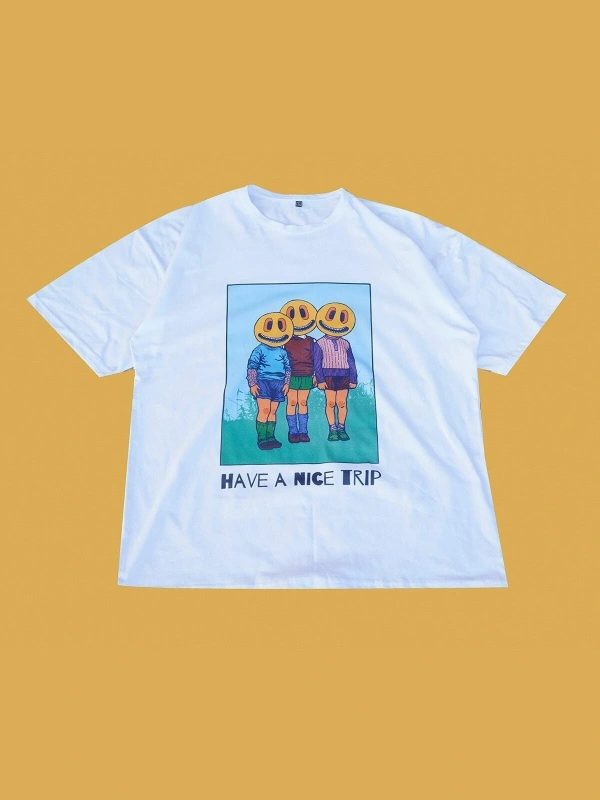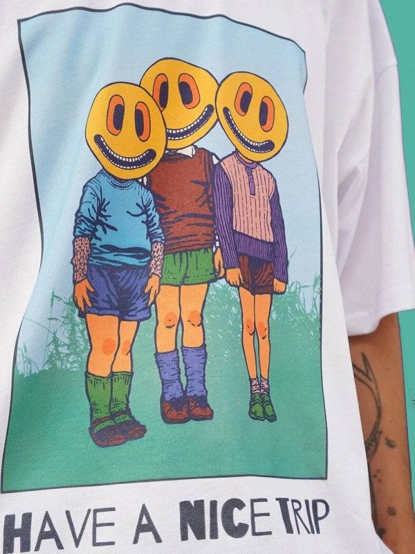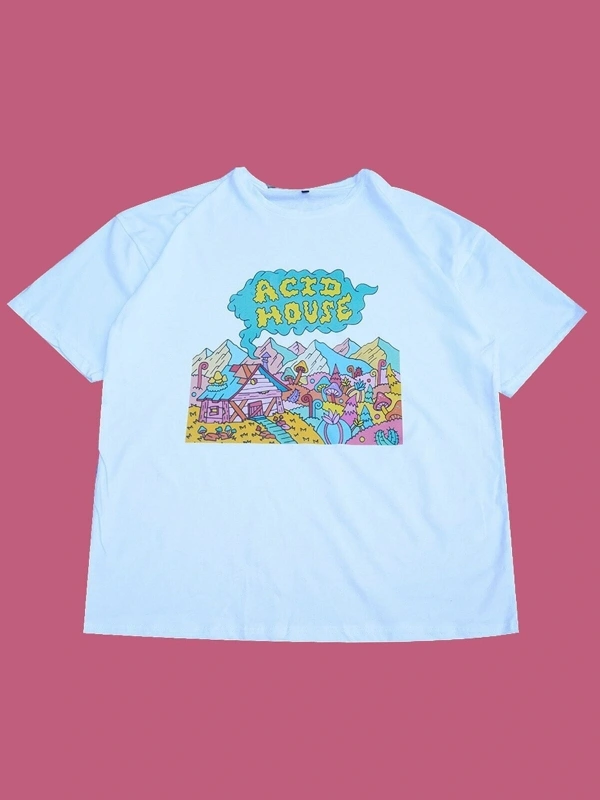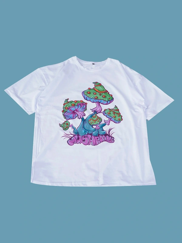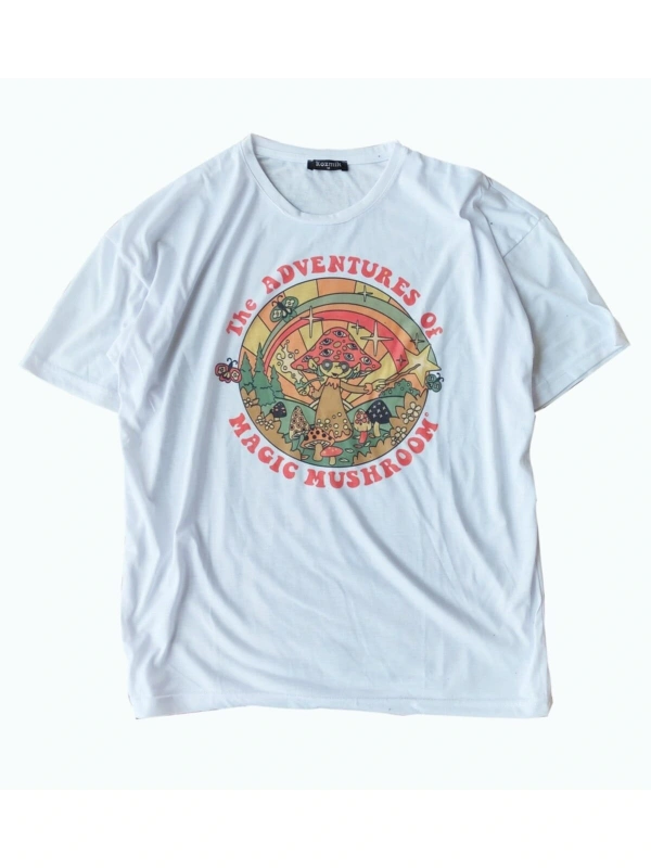 Kadın Beyaz Mantar Şapkalı Kız Baskılı Bisiklet Yaka Oversize Pamuklu T-shirt