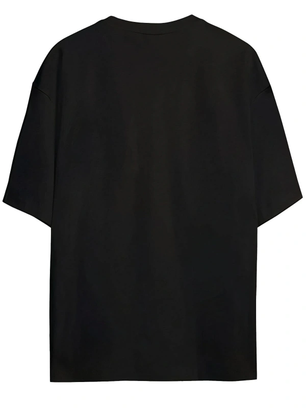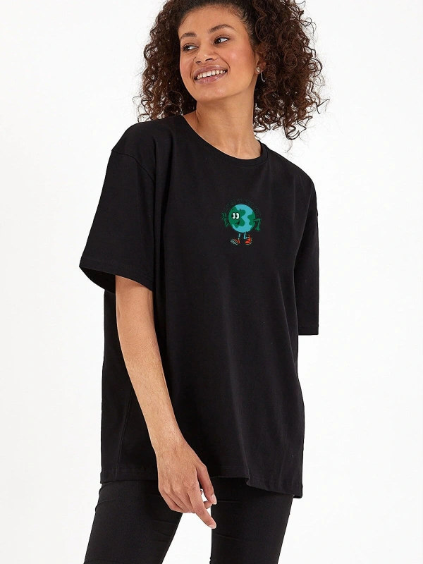 Kadın Siyah Earth Baskılı Bisiklet Yaka Oversize Pamuklu T-shirt