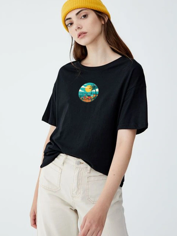 Kadın Siyah Önü Mantar Şapkalı Kız Baskılı Bisiklet Yaka Oversize Pamuklu T-shirt