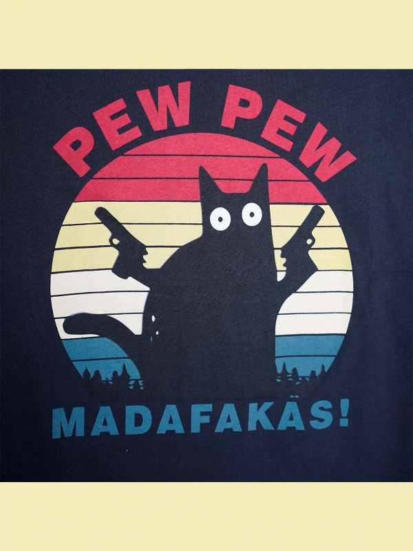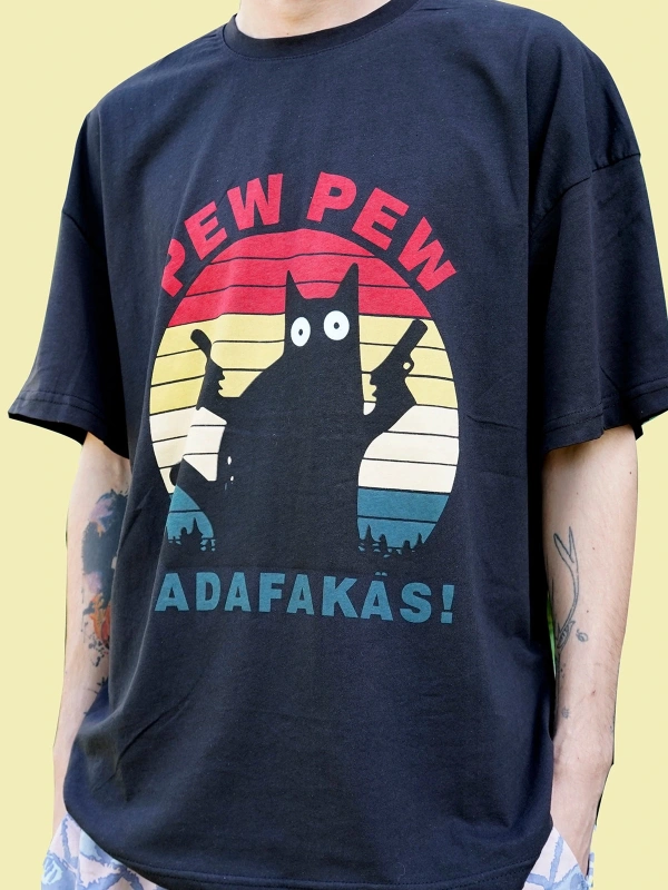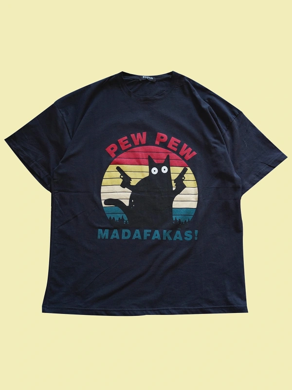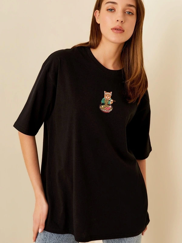 Kadın Siyah Önü Şef Kedicik Baskılı Bisiklet Yaka Oversize Pamuklu T-shirt