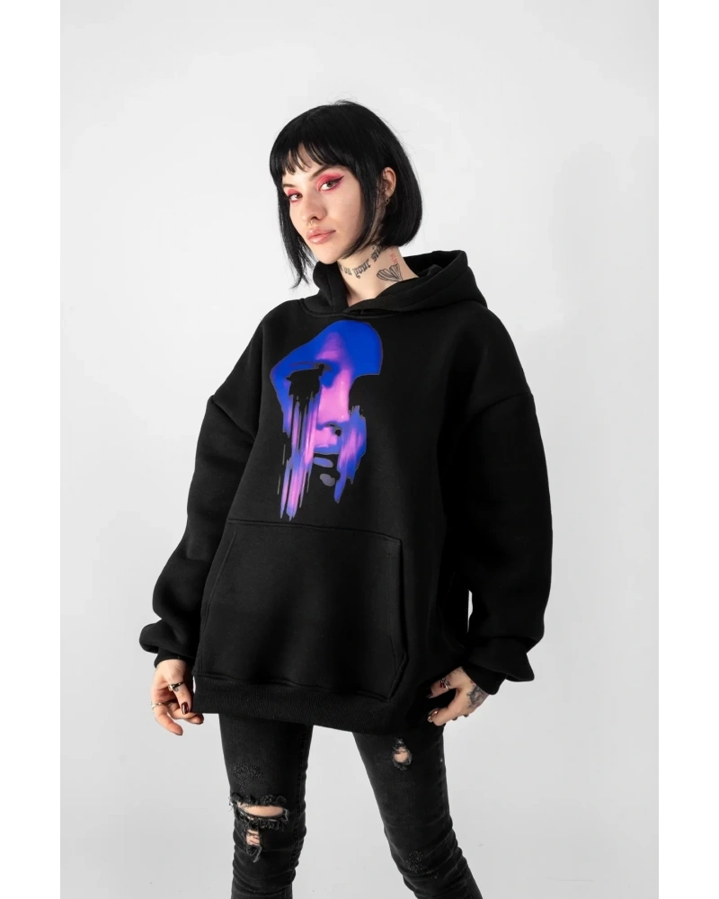 YQYQ----Oversize Powerpuff Girls Tasarım Baskılı Kapüşonlu Sweatshirt Hoodie Siyah