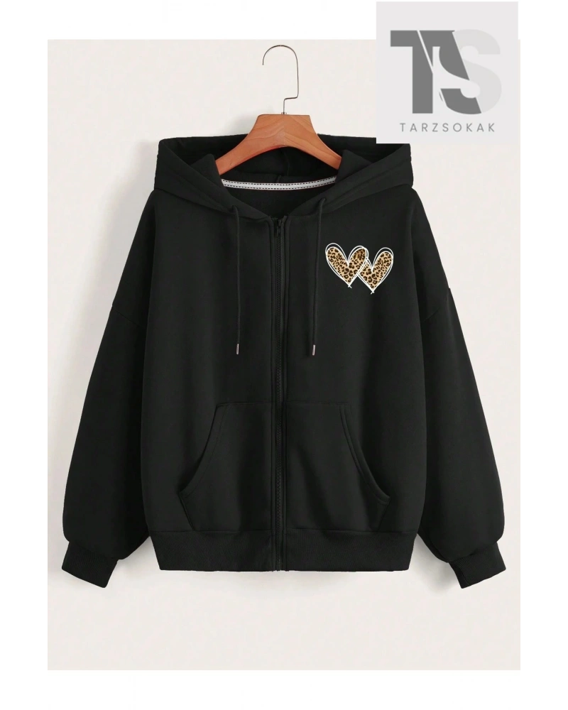 Leopar Desen Kalpler Sweatshirt Fermuarlı Hırka