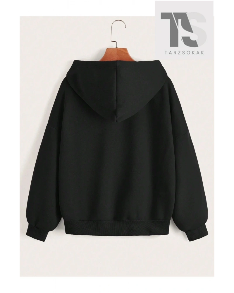 Büyük Beden Örümcek Ağı Silver Baskılı Kapüşonlu Fermuarlı Oversize Kadın Ceket-swe Siyah