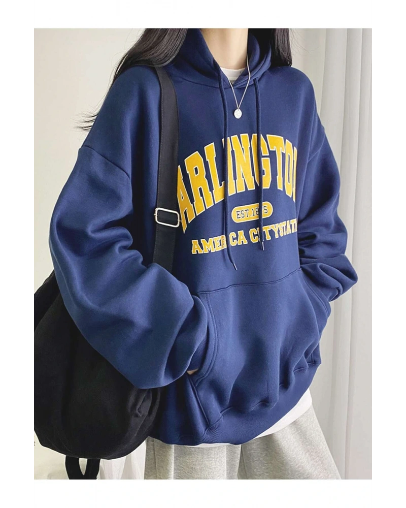 Mektup Grafik Damla Omuz Kanguru Cep İpli Hoodie Tee Olmadan MAVİRENK