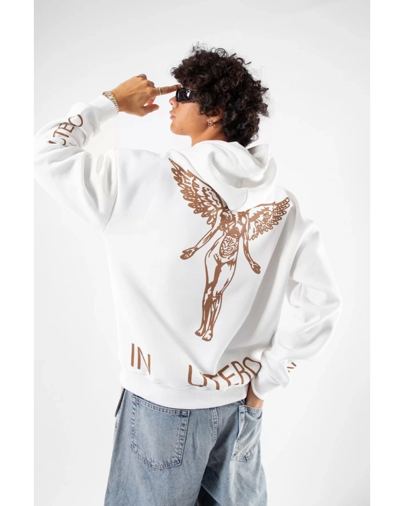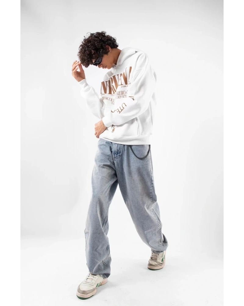 YQYQ----Oversize Araba Nissan Tasarım Baskılı Kapüşonlu Sweatshirt Hoodie Beyaz