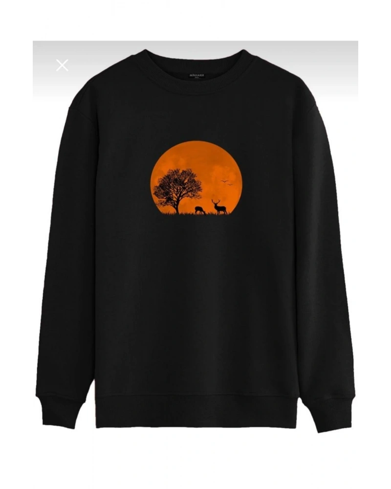 Oversıze Sıyah Savana Baskılı 0 Yaka Kapşonsuz Pamuklu Sweatshirt Siyah