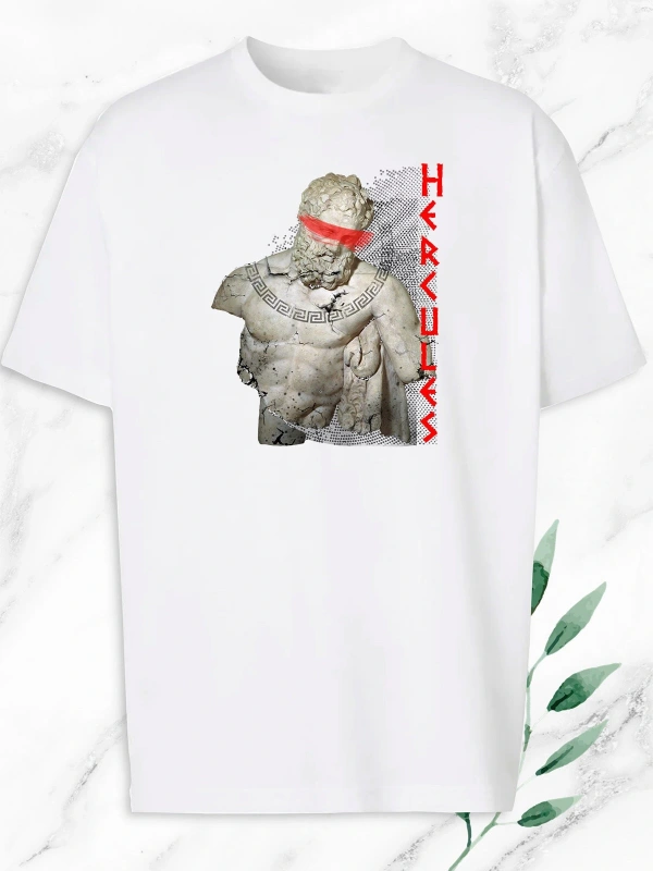 Beyaz Oversize Mitoloji Herkül Herakles Heykel Baskılı Tişört