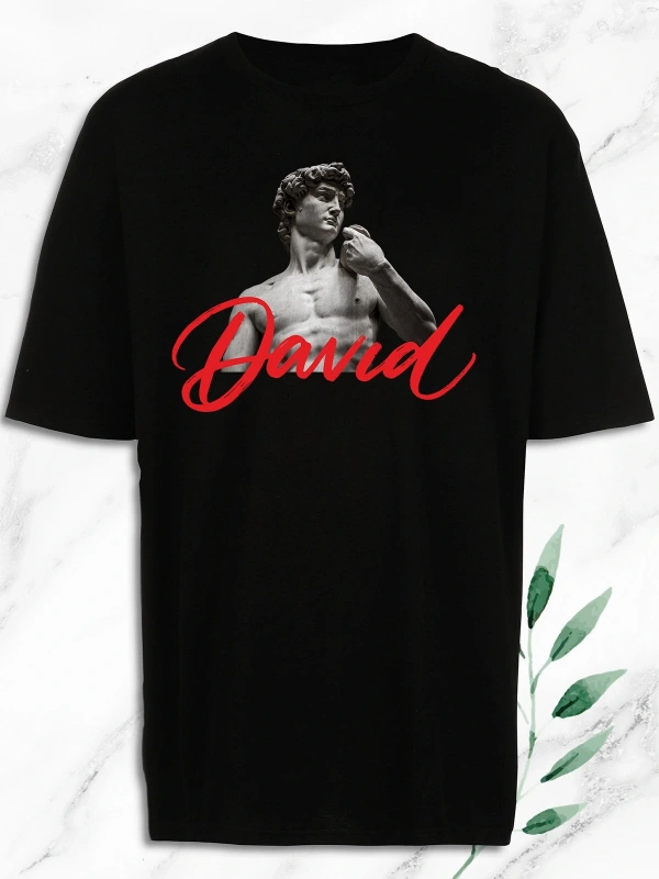 Oversize Mitoloji Davut Heykeli Baskılı Siyah Tişört