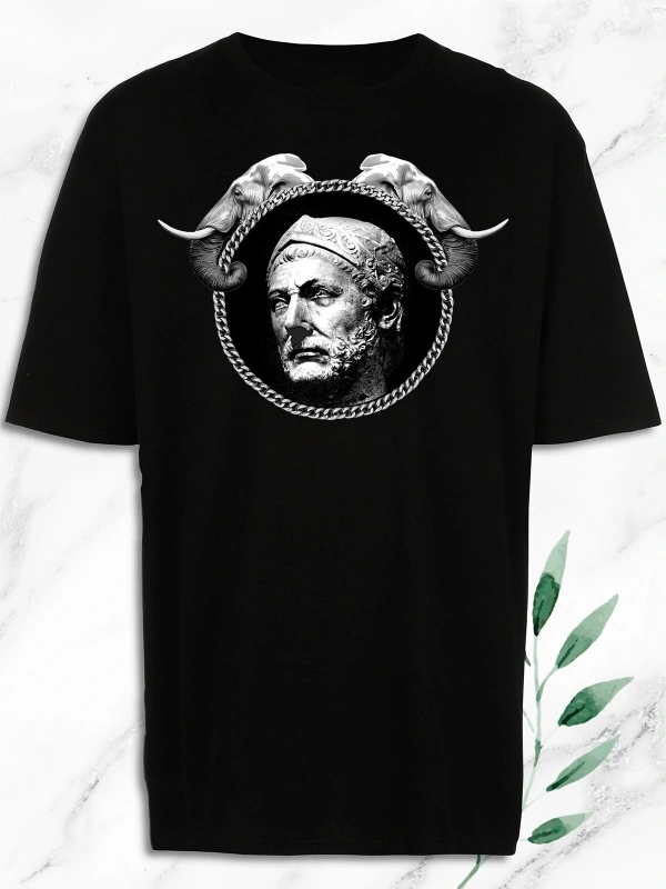 Oversize Mitoloji Komutan Hannibal Barca Heykel Baskılı Siyah T-Shirt