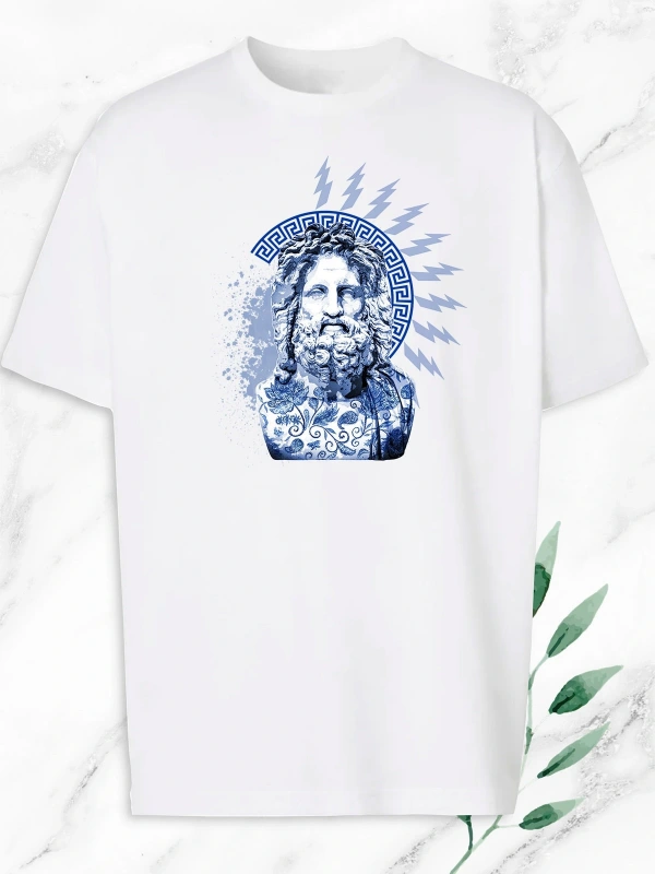 Oversize Mitoloji Zeus Heykel Baskılı Beyaz T-Shirt