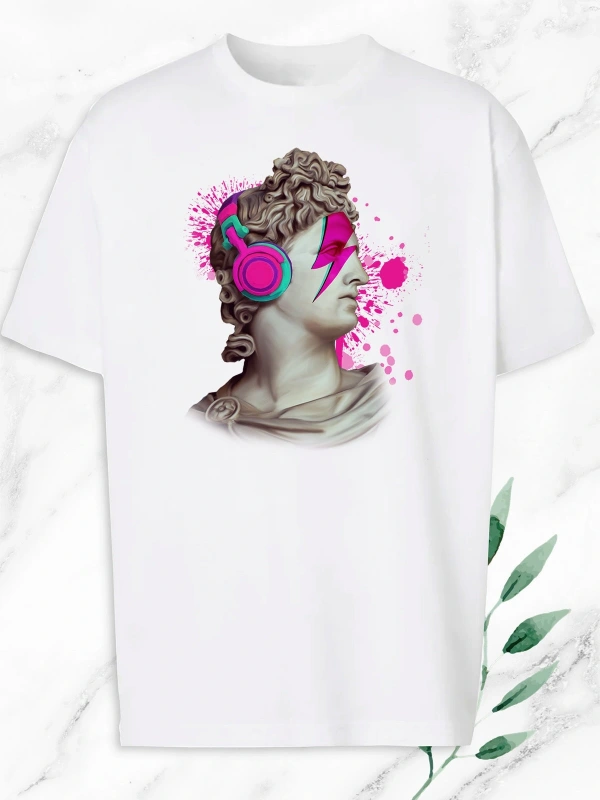 Unisex Oversize Mitoloji Trend Heykel Baskılı Beyaz Tişört