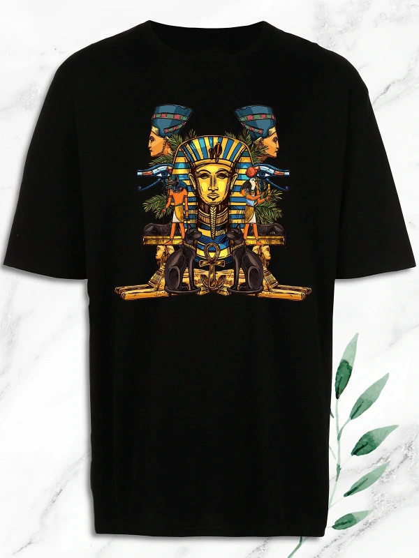 Unisex Siyah Oversize Antik Mısır Egypt Firavun Baskılı Tişört